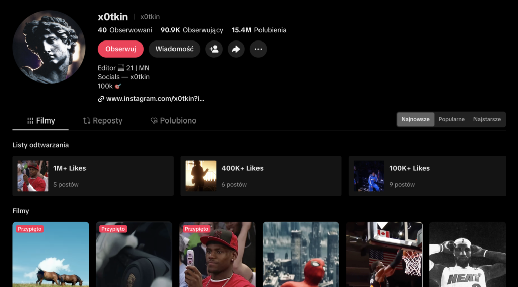 x0tkin, podobnie jak wulej jest niezależnym twórcą operującym na platformie TikTok, specjalizującym się w tworzeniu editów. Głównie jego twórczość, koncentruje się na editach różnych dzieł popkulturowych. W jego przypadku kluczowe stają się pierwsze sekundy materiału, tempo, energia i takie prowadzenie obrazu, które od razu przyciąga uwagę odbiorcy.