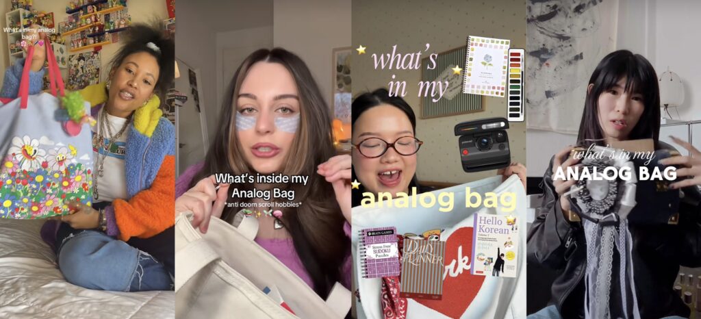 Równolegle rośnie zainteresowanie tym, co fizyczne i „offline’owe”: winyle, CD i MP3 jako alternatywa dla streamingu, książki jako forma skupienia, rękodzieło i journaling jako powolne praktyki, aparaty analogowe, jako zmiana sposobu patrzenia. W tym kontekście szczególnie ciekawym zjawiskiem są analog bags – trend, który popularność zyskał na TikToku i Youtube. To nie jest po prostu „moda na torbę bez telefonu”. To raczej mikrostrategia organizowania uwagi w świecie, który domyślnie ją rozprasza.